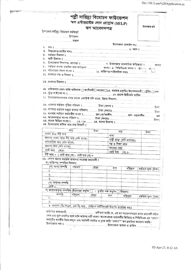 জরিপ প্রতিবেদন | ঋণের আবেদন ফি: ১০০/- (একশত) টাকা এ্যাপ্রাইজাল ফি: ঋণের ১% প্রাপ্তিস্থানঃ উপজেলা দারিদ্র্য বিমোচন কর্মকর্তার কার্যালয়। | ৫-১০ দিন |
